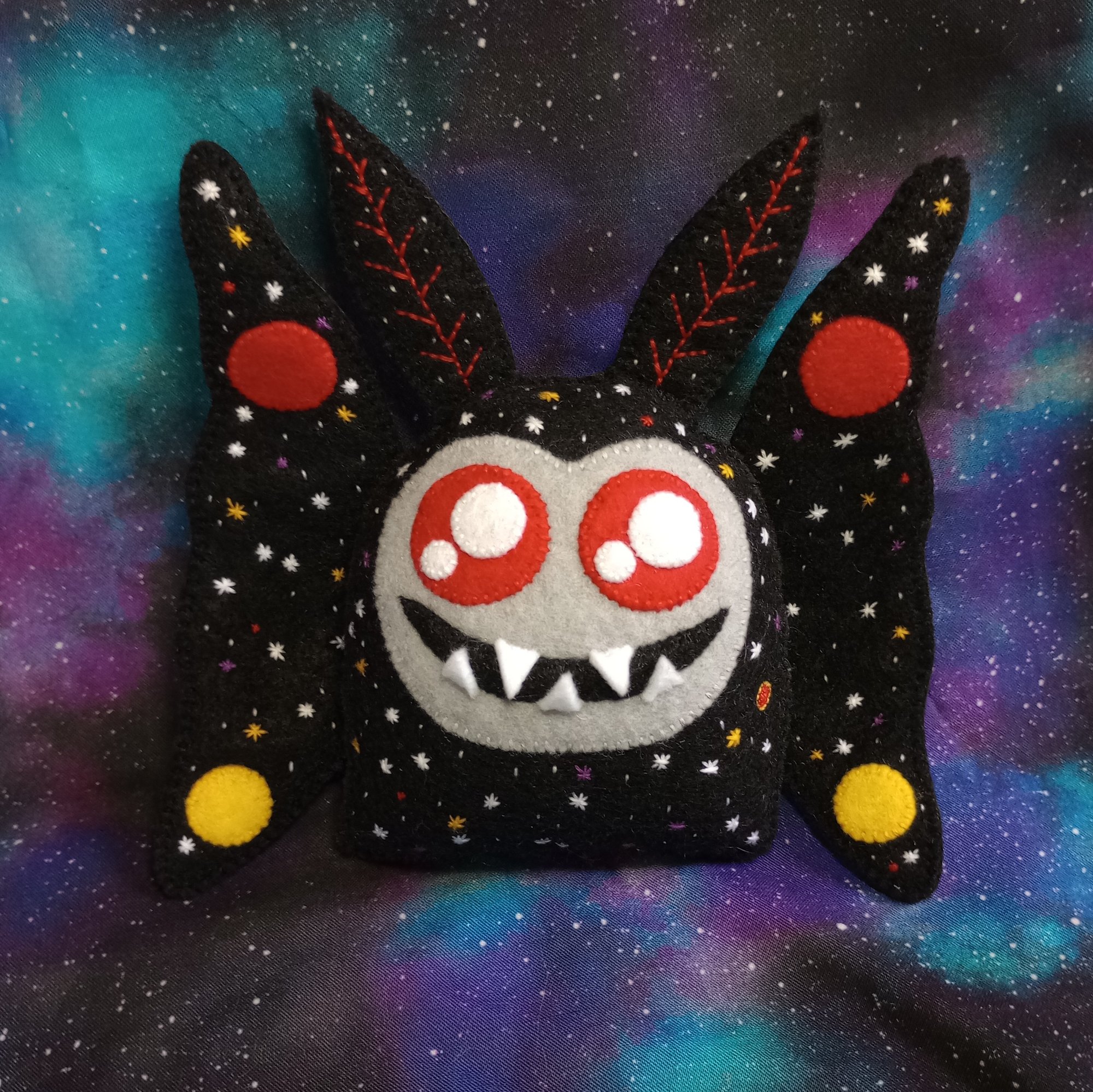 I designed and hand-sewed this fabric art cosmic moth creature. I hand-embroidered all her stars and planets, so she took forever and a day to create. This is Marigold the Cosmic Moth of Destiny. She enjoys trying out new kinds of cheese, singing along to pop music as she travels at the speeds of light, and fluttering through the windows of jerks and transmogrifying their eyelashes into tiny grubs.