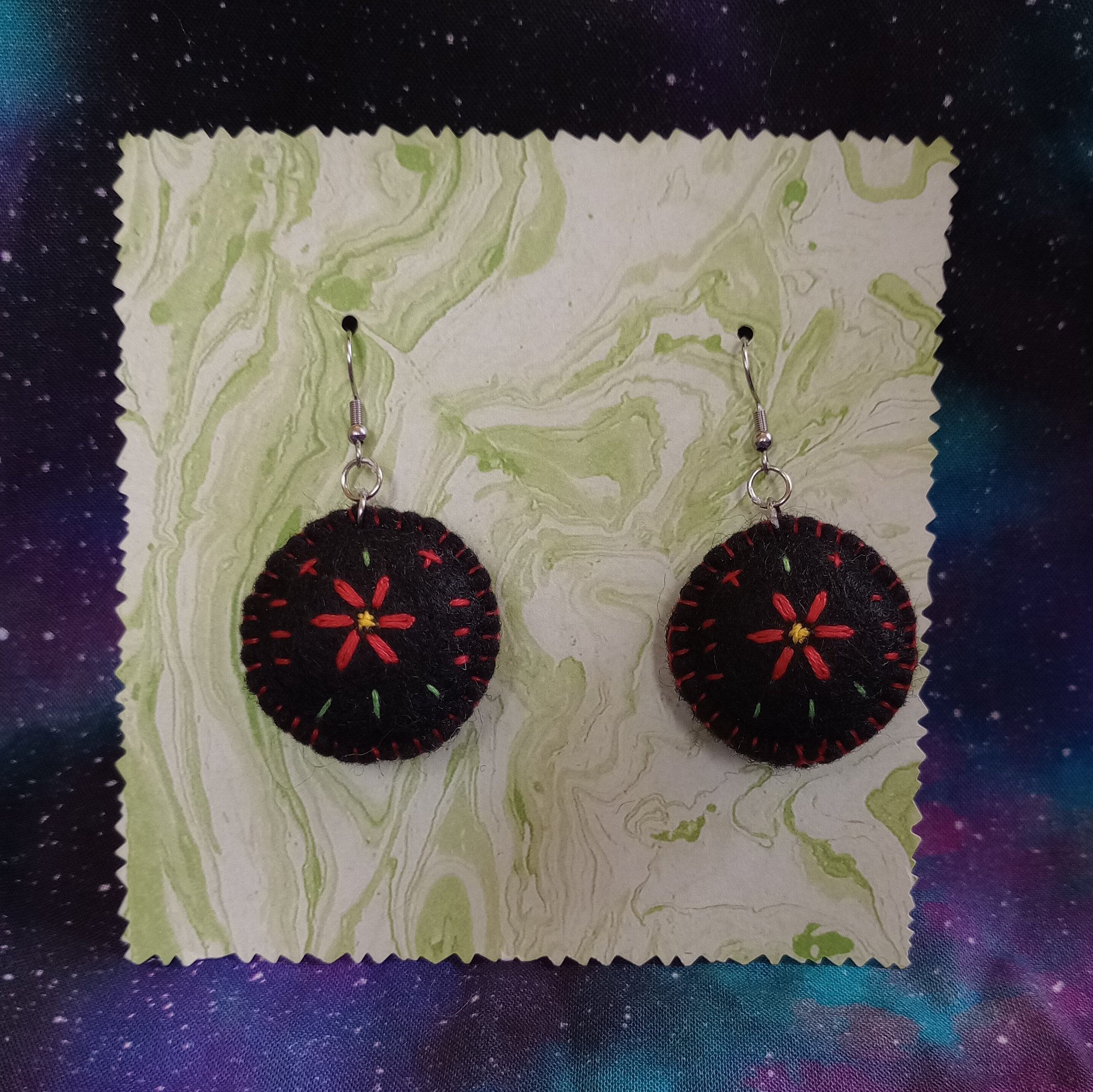 I designed, hand-sewed, and hand-embroidered these semi-mystical, fabric art earrings featuring red flowers. The metal is stainless steel and hypoallergenic. These earrings are saturated with a mild, almost ineffective charm that will help the wearer to see slightly more birds than they might expect. The charm will also allow the wearer to feel a bit more cozy than usual.