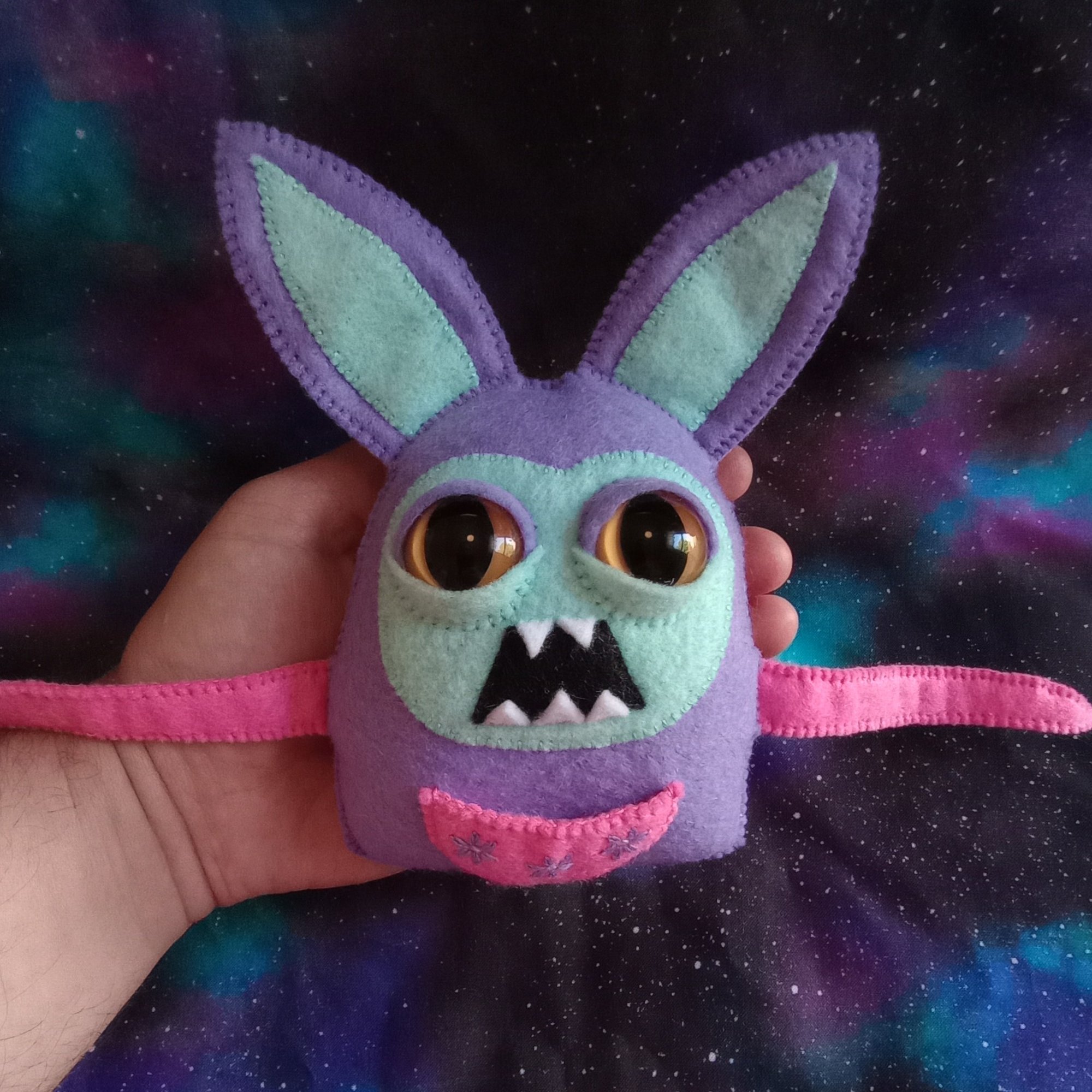 Meet my fabric art rabbit Sweet Theodore! I designed and hand-sewed him. Despite the fact that Sweet Theodore was born from a gnarled, glowing egg in the catacombs, he insists he's a completely ordinary rabbit. He uses his pouch to carry around his tiny friends and his vintage monster finger puppet. Theodore enjoys being sneaky, playing cozy video games, and finding cursed objects at antique stores.